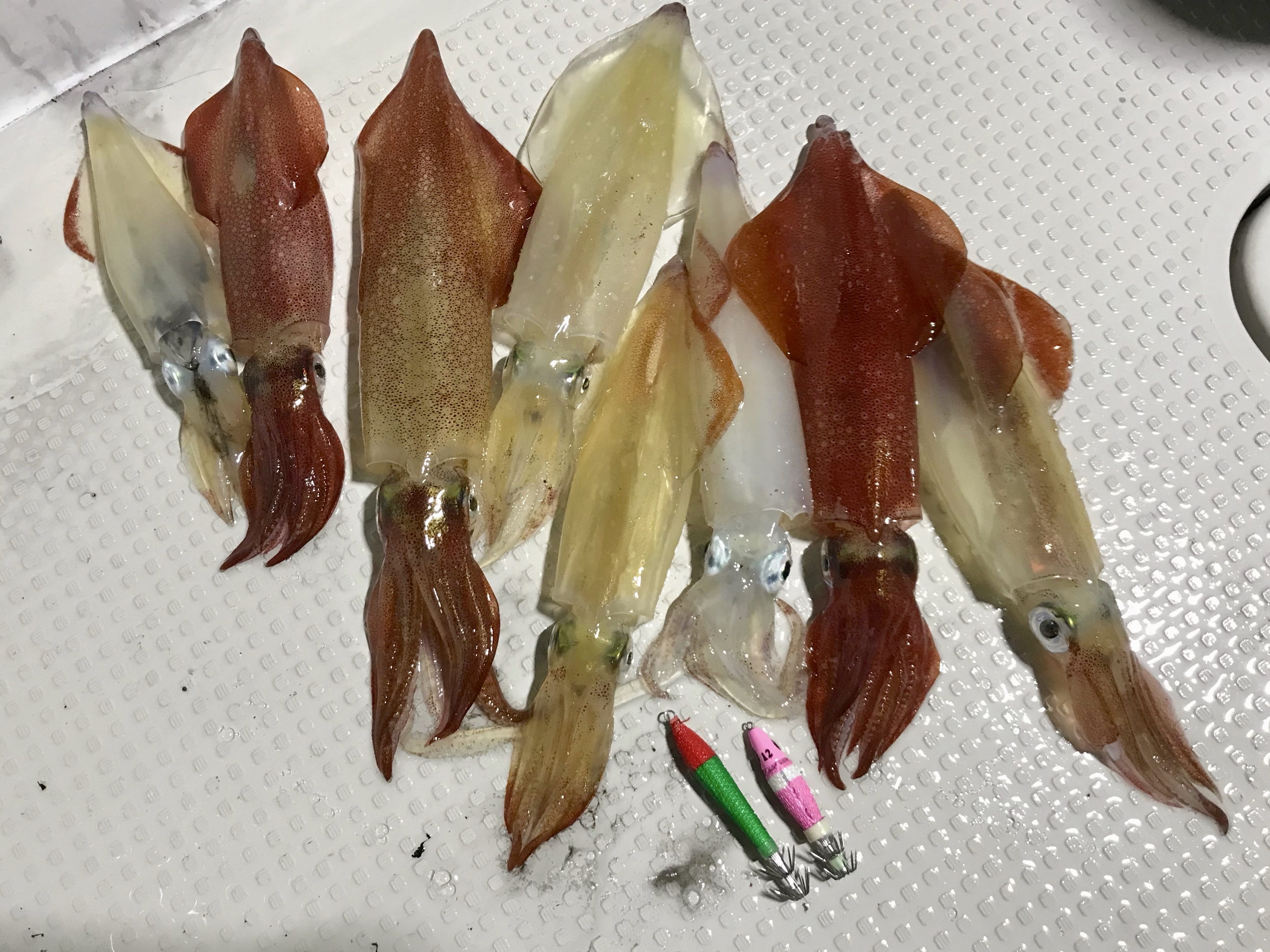 船も多くアタリの少ない日でしたが 最近、マイフェイバリット化しているサウスッテ極どピンク➕八角スッテレッドグリーンを駆使し