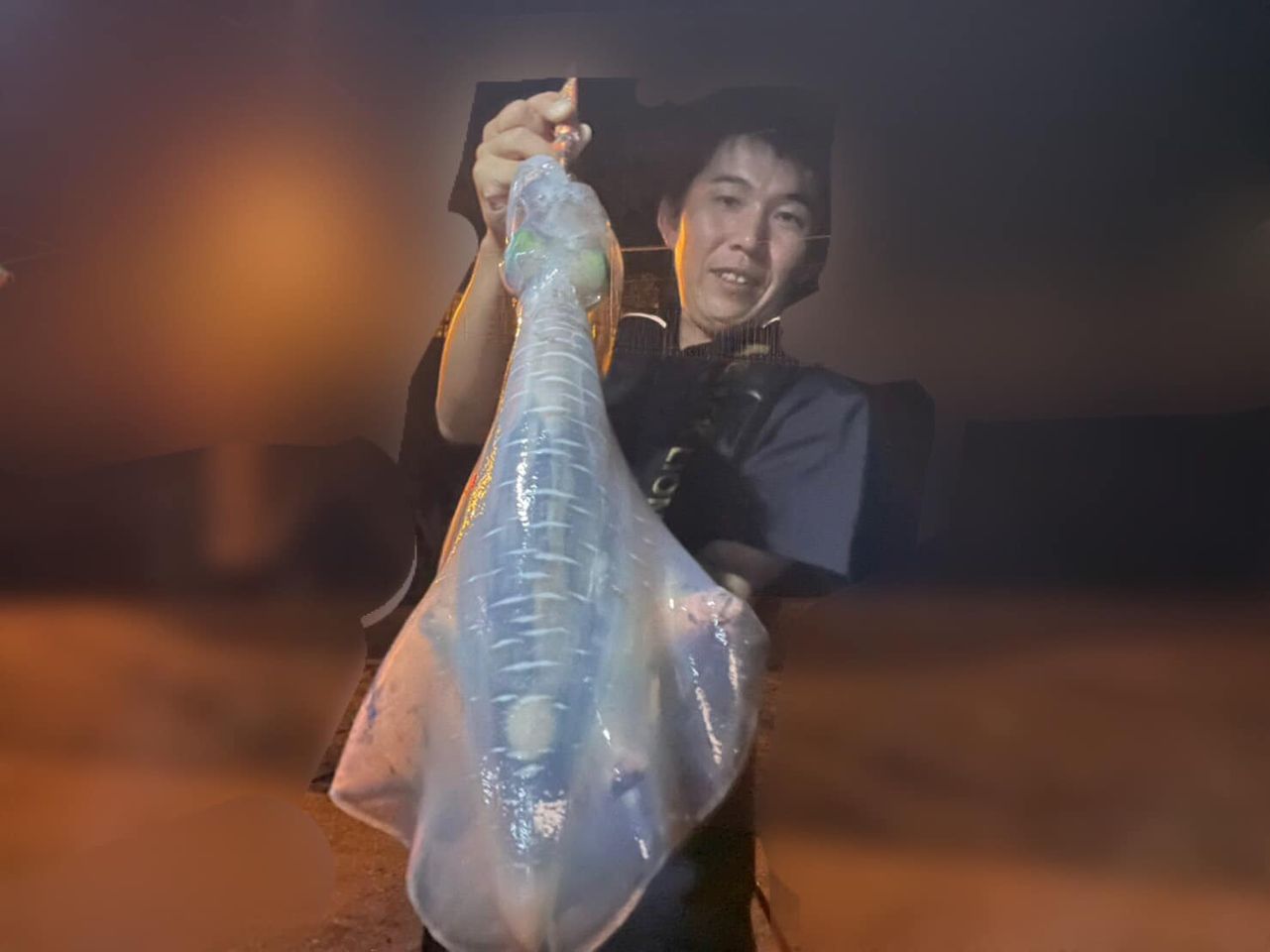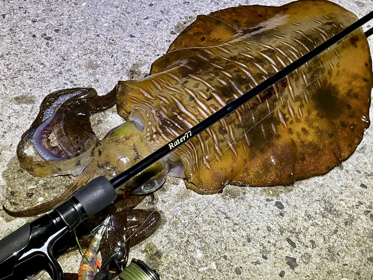 上がってきたのは…1400gのアオリイカコレには大満足