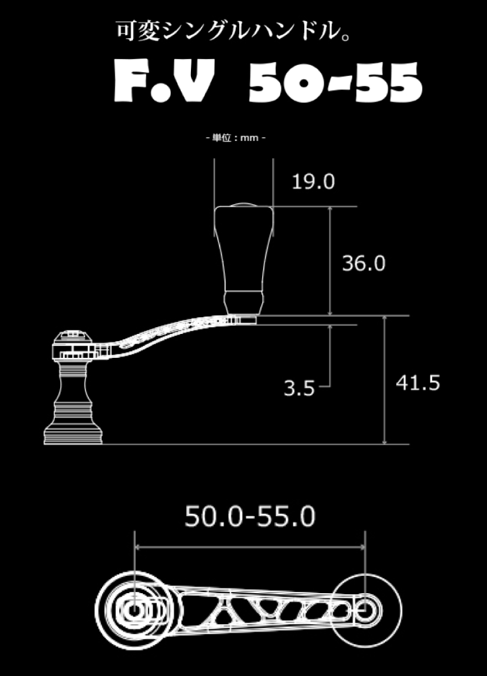 内側セッティングにするとハンドル長さが50mm 外側セッティングにすると55mmと5mmの範囲内で好みの長さにすることが可能。